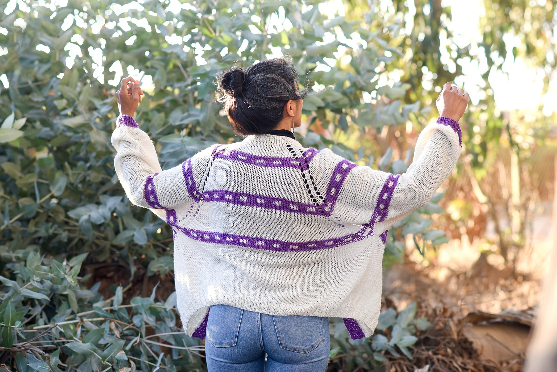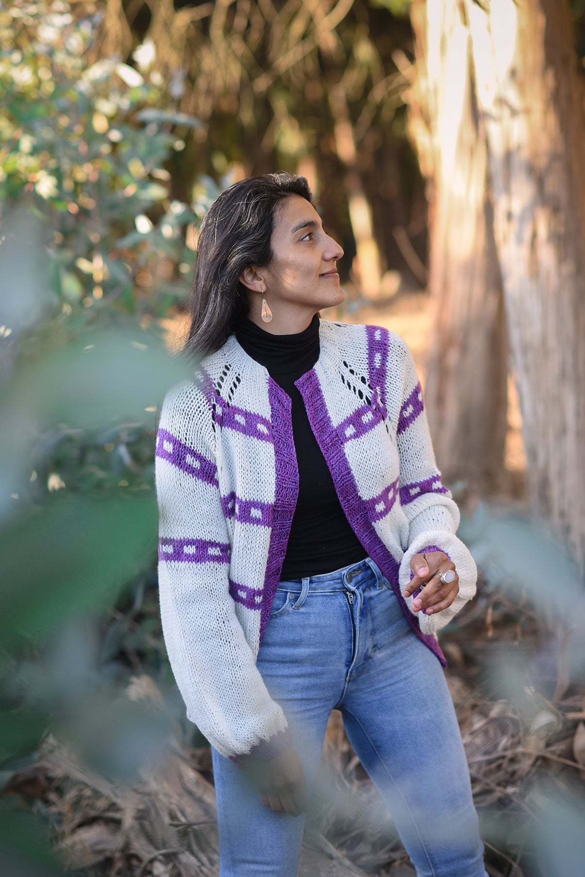 Este es un Chaleco tejido sin costuras, estilo raglán y con un detalle en el diseño usando la técnica Jacquard, que va mezclando colores a medida que vas tejiendo, este tipo de técnica de tejido resalta y destaca este diseño, todo el proceso de su confección es lento, tejido con mucho cariño y dedicación en cada puntada.