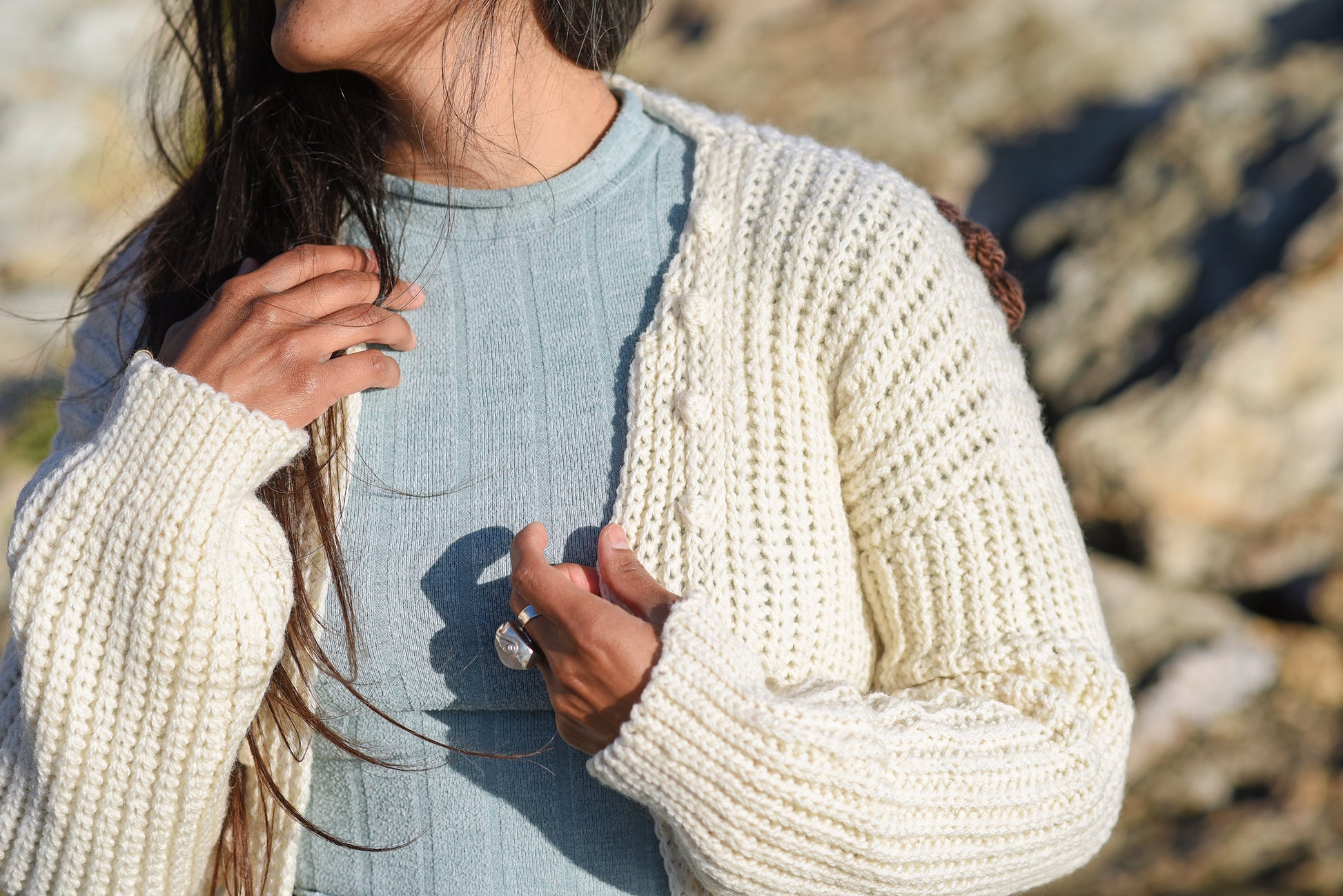 Este Chaleco es tejido a mano, en un proceso lento, con mucho cariño y dedicación, usando Lana natural y 100% de Oveja raza Merino obtenida de forma respetuosa con los animales. Este hilado es una fibra gran calidad y absoluta suavidad. La lana es de color crudo natural.