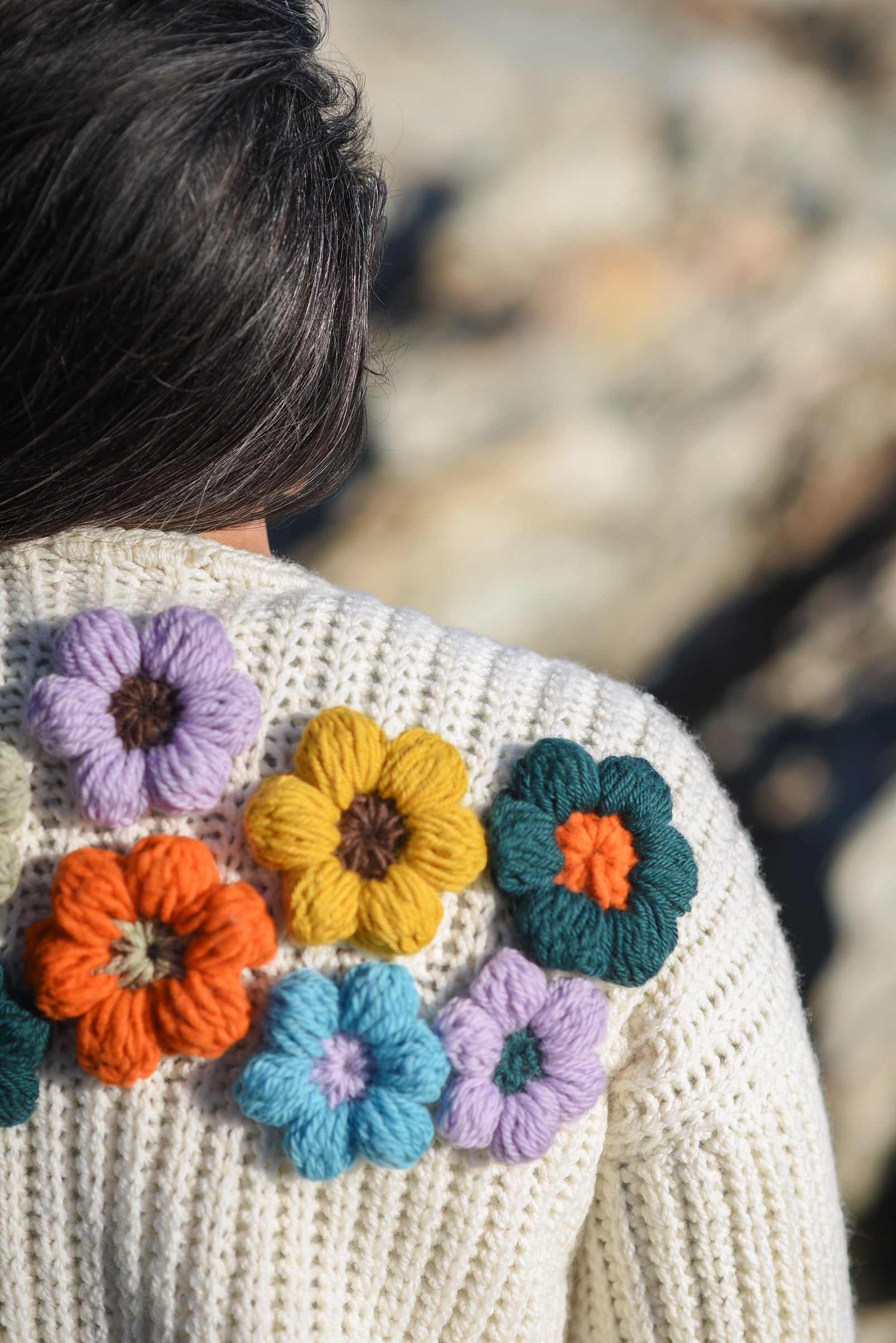 Tiene detalles delicados tejidos en los delanteros, y en la espalda lo que resalta sin duda, son las flores coloridas tejidas una a una, y luego ubicadas en la espalda del Chaleco, al ser un tejido de color crudo natural, las flores en la espalda de distintos colores y combinaciones son el diseño que destaca y hace único este Chaleco.