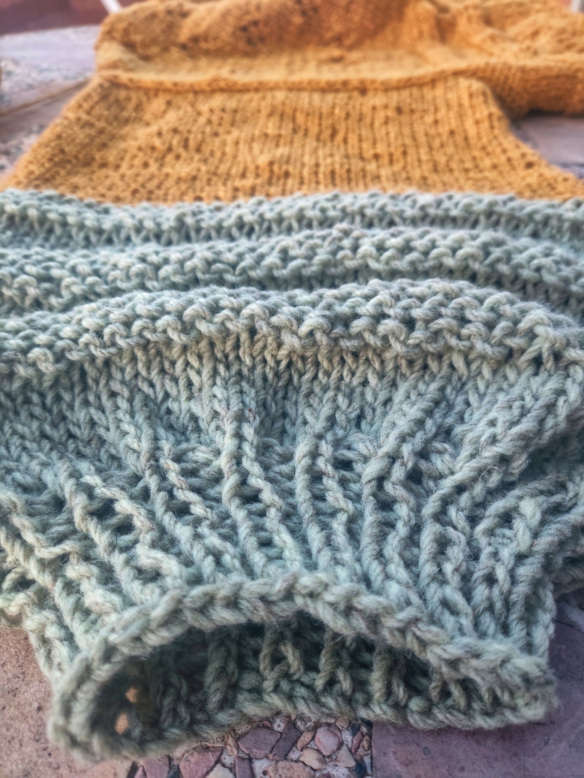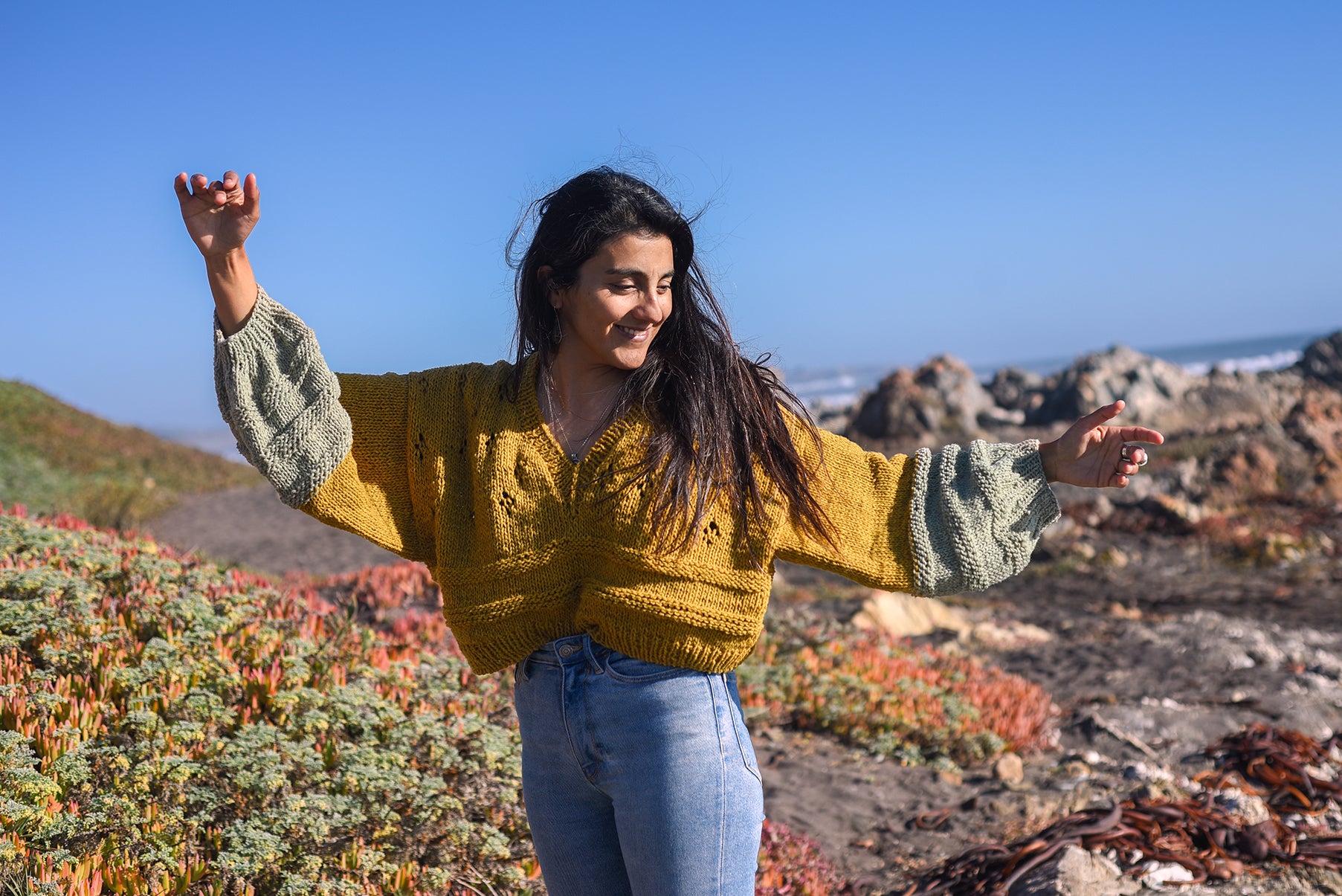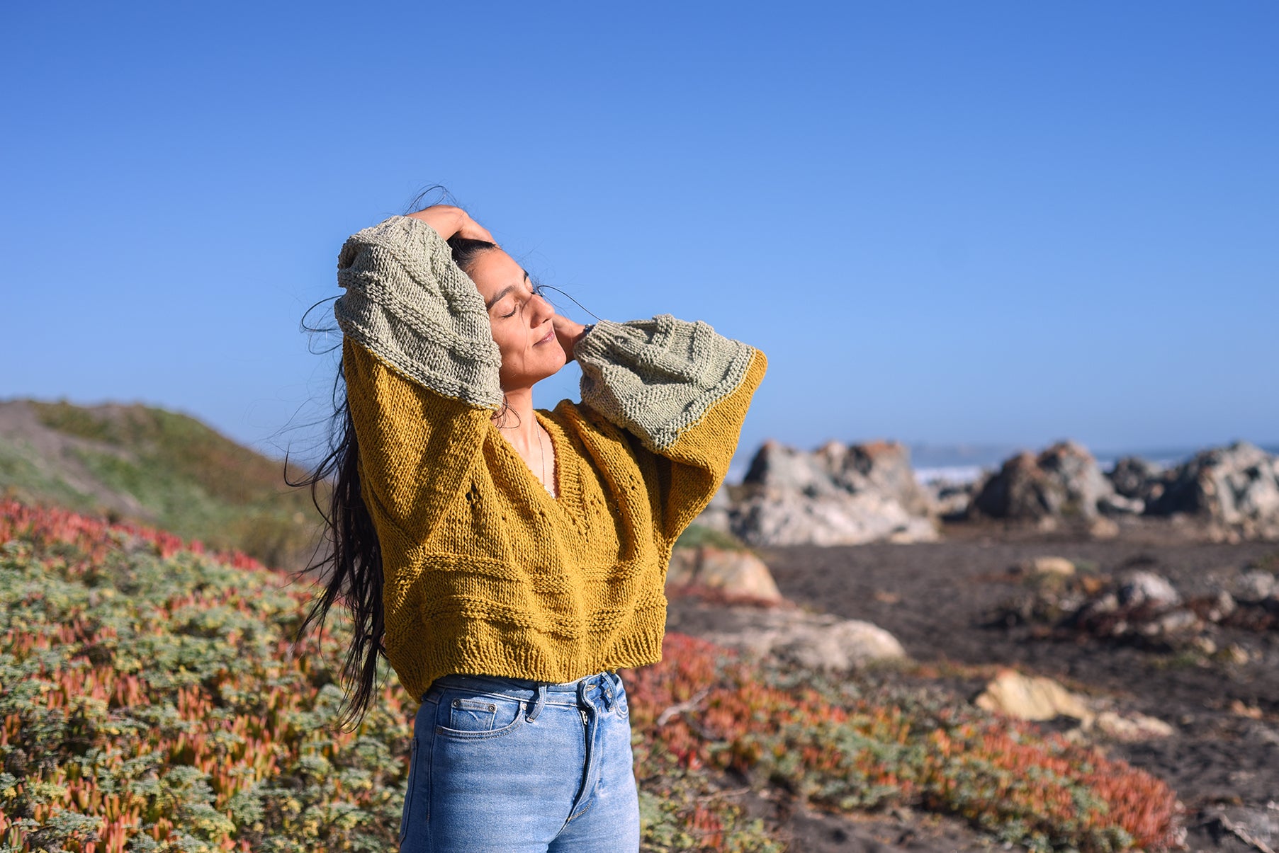Este es un Sweater tejido a mano, holgado y de mangas anchas, con un diseño calado en la parte superior y con puntos en relieve iguales en mangas y cuerpo del tejido. El tejido es un proceso lento, y además está hecho puntada a punta con mucho cariño y dedicación.
