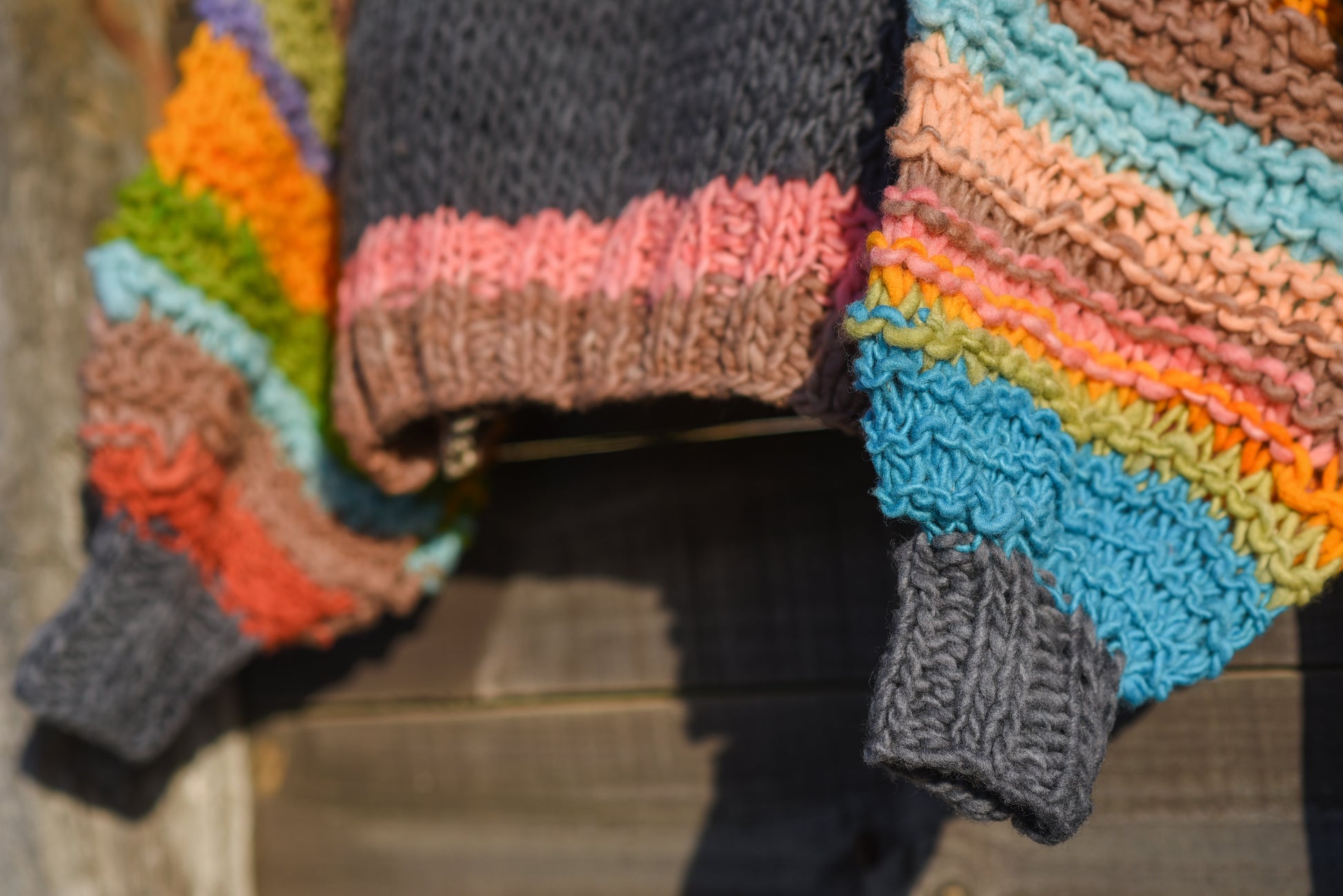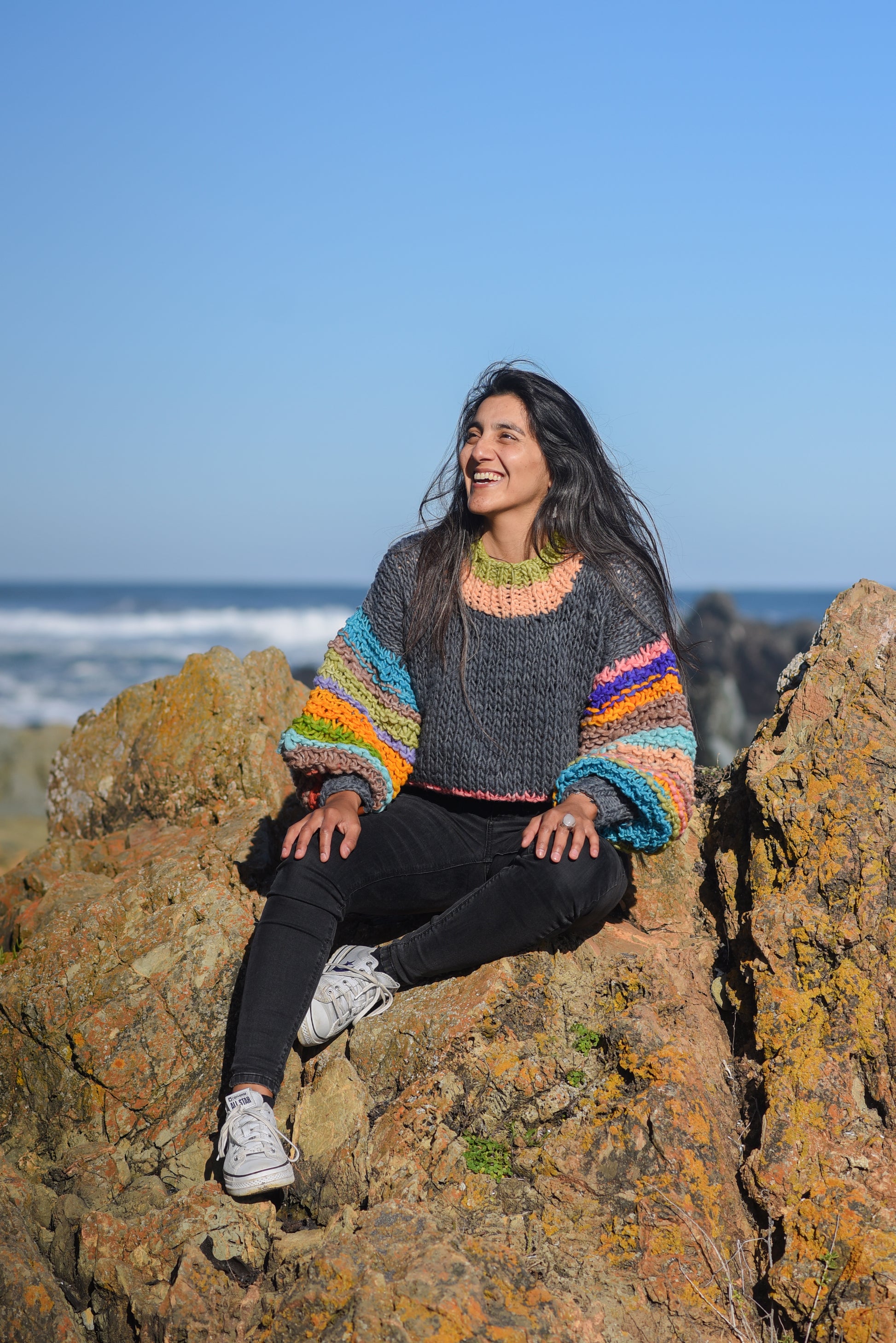 Este Sweater es tejido a mano, en un proceso lento, con mucho cariño y dedicación. Las mangas, pretina y cuello las tejí con una mezcla de colores espontánea preparada previamente al tejido, mientras se va ovillando cada gramo de lana.